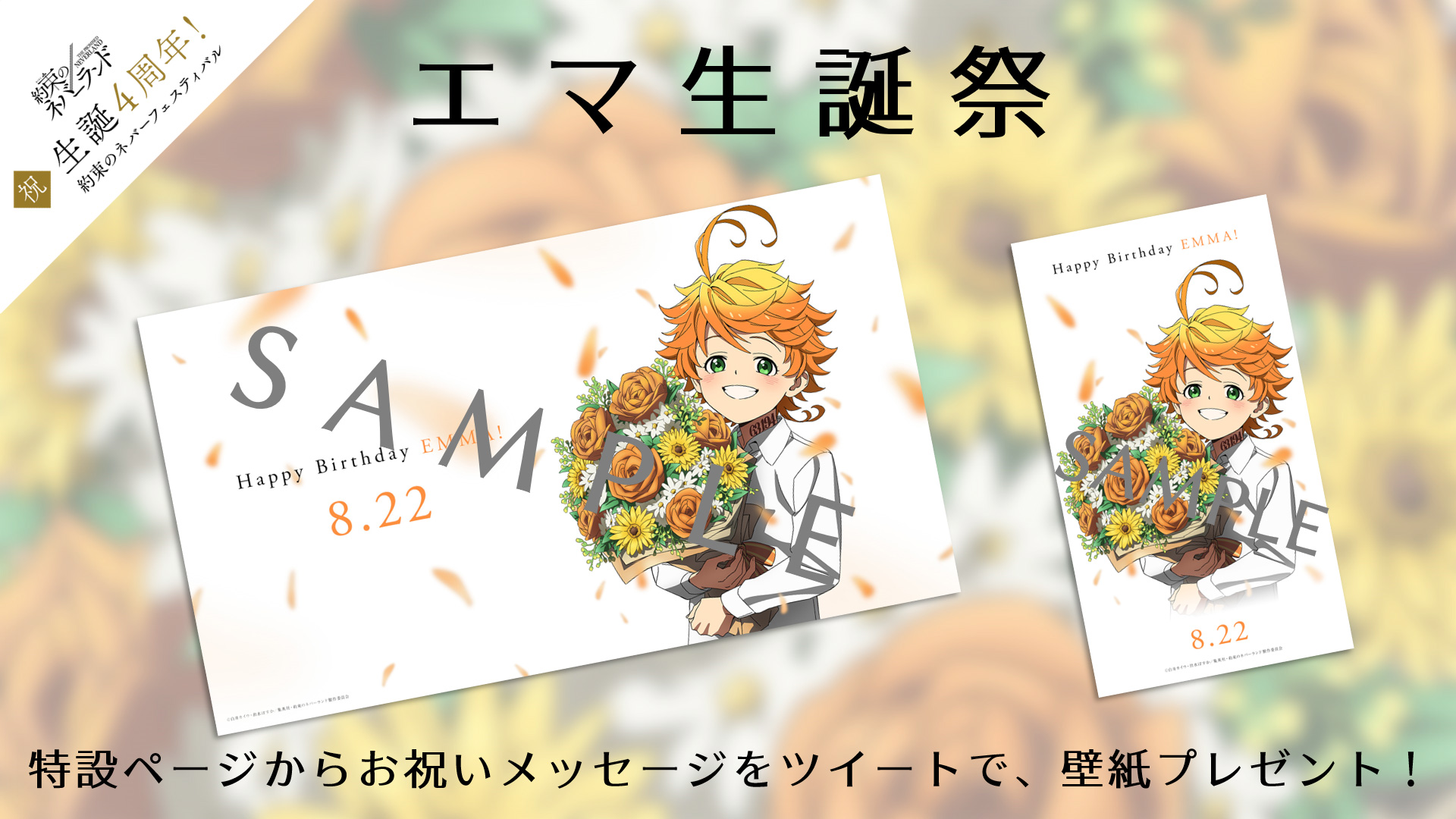 約束のネバーランド 公式 Happy Birthday エマ 8月22日はエマの誕生日 約ネバ 生誕4周年記念特設ページでは エマ生誕祭を実施中 特設ページからお祝いメッセージをツイート 表示されたパスワードをフォームに入力 で アニメ描き下ろしイラスト